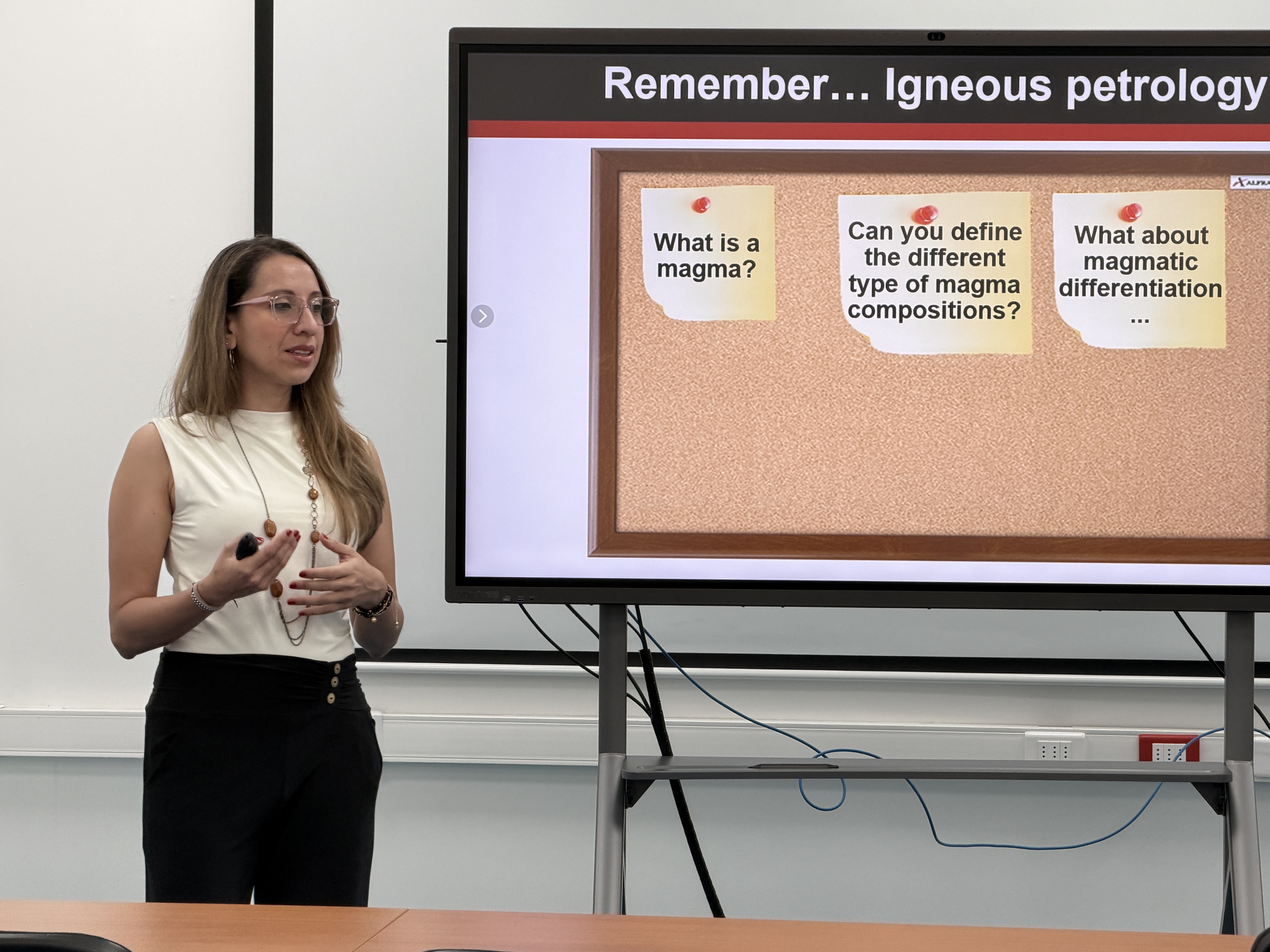 Durante su visita, la Dra. Siachoque dictó el curso de Exploración de litio, el cual combinó fundamentos teóricos con ejercicios prácticos, orientados a fortalecer las habilidades de las y los estudiantes en la interpretación de análisis geológicos y en la exploración de recursos estratégicos, como rocas pegmatíticas, depósitos de salares y depósitos volcanosedimentarios.